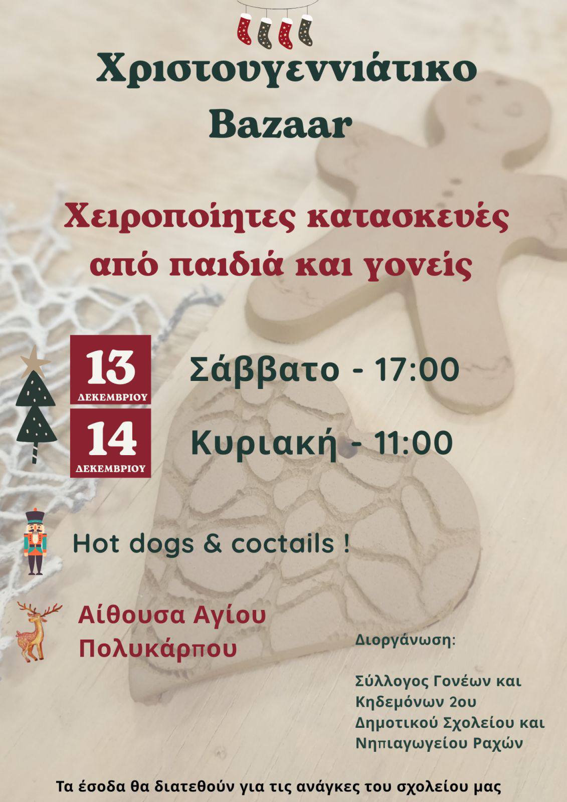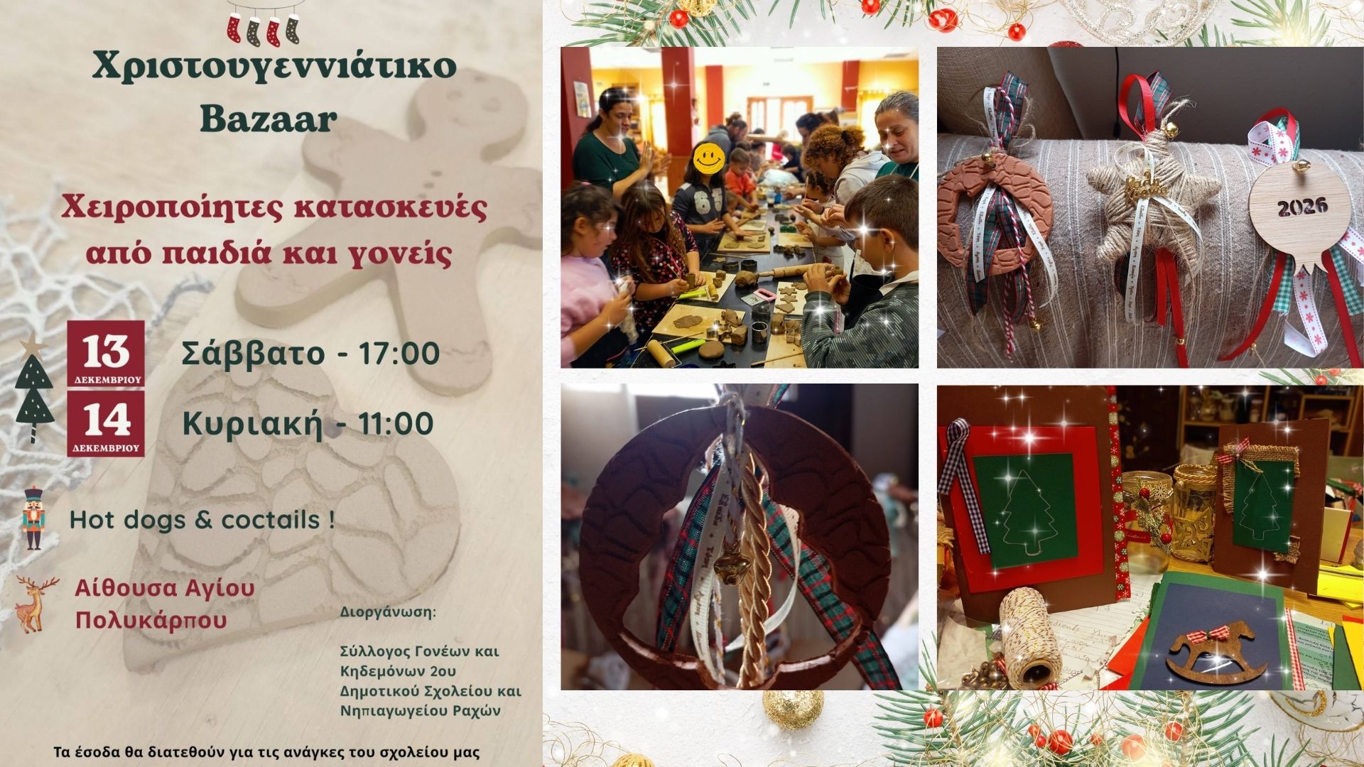 O Σύλλογος γονέων και κηδεμόνων του Δημοτικού και Nηπιαγωγείου Αγίου Πολυκάρπου σας καλεί στο χριστουγεννιάτικο μπαζαρ που διοργανώνει αυτό το Σαββατοκύριακο 13/12 &14/12 .