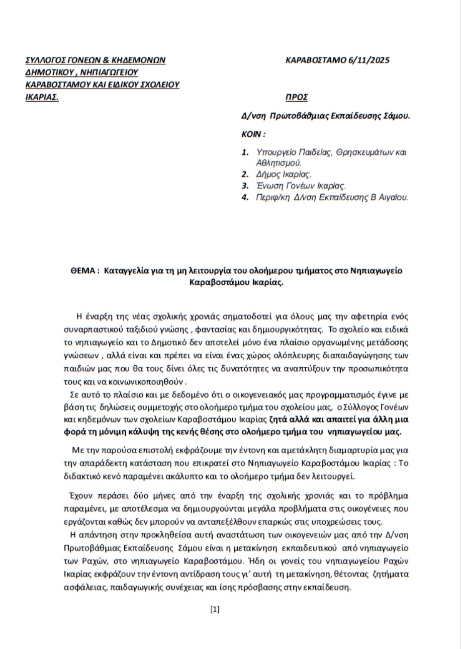 Την έντονη διαμαρτυρία του για τη μη λειτουργία του ολοήμερου τμήματος στο Νηπιαγωγείο Καραβοστάμου Ικαρίας εκφράζει ο Σύλλογος Γονέων και Κηδεμόνων Δημοτικού, Νηπιαγωγείου και Ειδικού Σχολείου Καραβοστάμου, με επιστολή που απέστειλε στις 6 Νοεμβρίου 2025 προς τη Διεύθυνση Πρωτοβάθμιας Εκπαίδευσης Σάμου, ενώ κοινοποιεί το έγγραφο στο Υπουργείο Παιδείας, τον Δήμο Ικαρίας, την Ένωση Γονέων Ικαρίας και την Περιφερειακή Διεύθυνση Εκπαίδευσης Βορείου Αιγαίου.