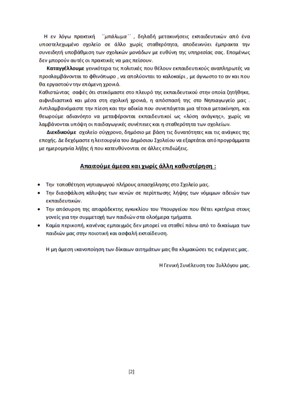 Παράλληλα, ο Σύλλογος καταγγέλλει τις γενικότερες πολιτικές υποστελέχωσης της εκπαίδευσης και ζητά μόνιμη κάλυψη της κενής θέσης, άμεση τοποθέτηση νηπιαγωγού πλήρους απασχόλησης στο σχολείο, καθώς και την απόσυρση της εγκυκλίου που θέτει κριτήρια για τη συμμετοχή των παιδιών στα ολοήμερα τμήματα.