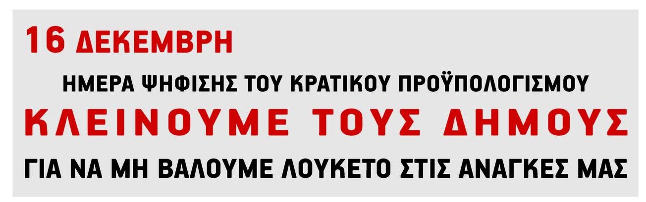 16 Δεκεμβρίου – Ολοήμερο κλείσιμο των υπηρεσιών του Δήμου, ενάντια στον προϋπολογισμό της φτώχειας και του πολέμου.