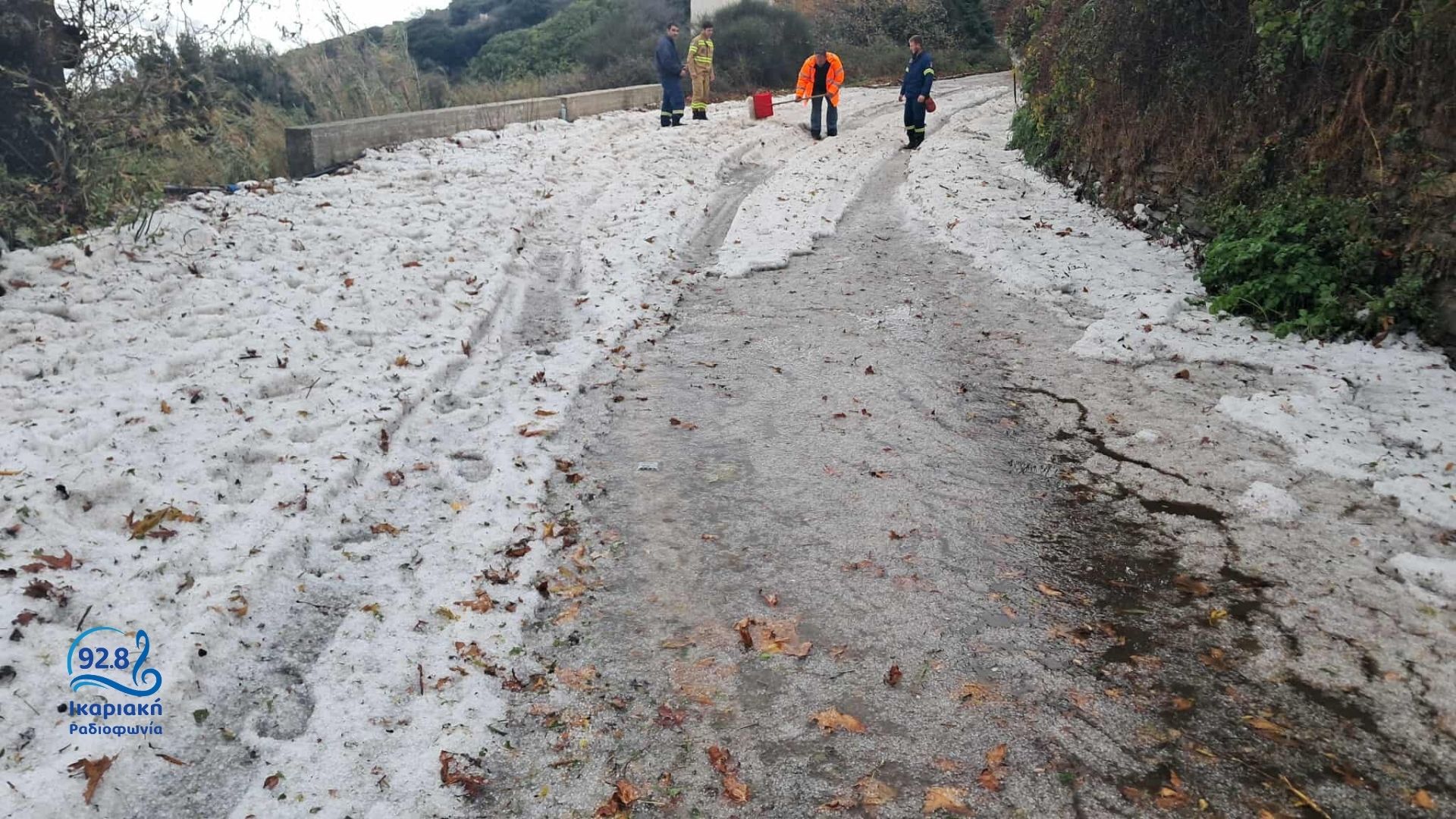 Χαρακτηριστική εικόνα από την Οξέ, όπου ο κεντρικός δρόμος καλύφθηκε από χαλάζι. Δυνάμεις της Πυροσβεστικής μαζί με τη συνδρομή του Επαρχείου αποκατάστησαν τη διέλευση.