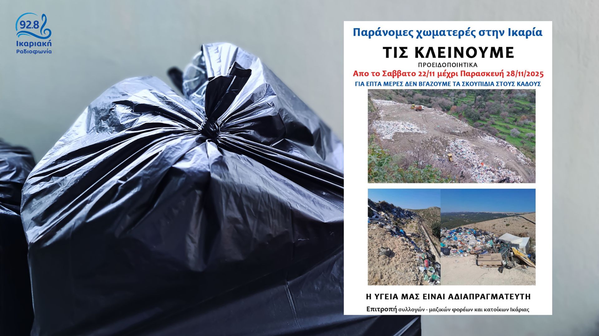 Σύμφωνα με το ψήφισμα Συλλόγων, Φορέων και κατοίκων της Ικαρίας στις 7 Νοέμβρη αποφασίστηκε να κλείσουν οι ΧΑΔΑ για 7 ημέρες ως διαμαρτυρία και προειδοποιητική κίνηση ώστε να προχωρήσει το θέμα με τη διαχείριση των απορριμμάτων στο νησί, ένα πρόβλημα που ταλανίζει για χρόνια την Ικαρία με σοβαρό κίνδυνο για την υγεία αλλά και για το περιβάλλον.