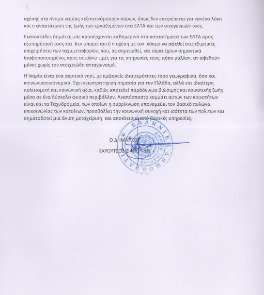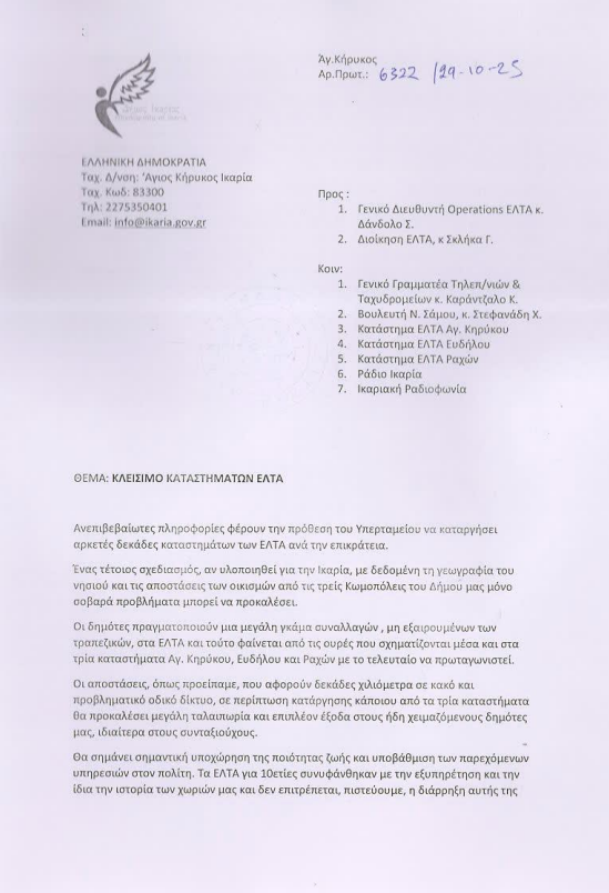 Ο Δήμαρχος Ικαρίας απευθύνει επιστολή στην διοίκηση των ΕΛΤΑ.