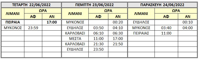 Φ/Γ-Ο/Γ “ΤΑΛΩΣ”: Προς εξυπηρέτηση μεταφοράς βυτίων καυσίμων και άλλων οχληρών από και προς τα ΜΕΣΤΑ, σας γνωρίζουμε ότι στο δρομολόγιο της Τετάρτης 22/06/2022 του πλοίου μας Φ/Γ-Ο/Γ «ΤΑΛΩΣ» στις 17:00 από ΠΕΙΡΑΙΑ προς ΜΥΚΟΝΟ – ΕΥΔΗΛΟ – ΚΑΡΛΟΒΑΣΙ θα προστεθούν προσεγγίσεις στα ΜΕΣΤΑ κατά μετάβαση και επιστροφή και το δρομολόγιο θα εκτελεστεί ως κάτωθι πίνακας :