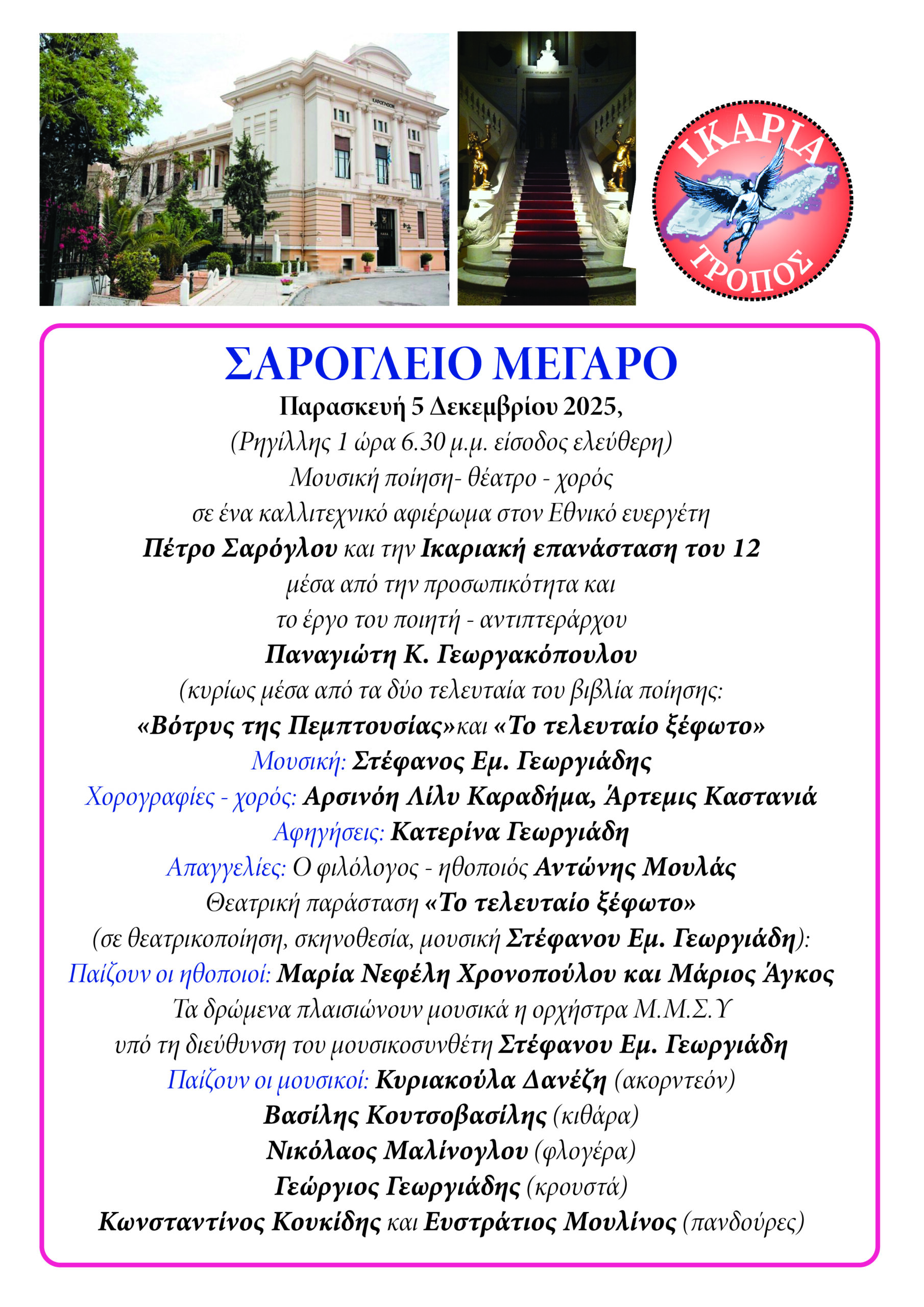 Την Παρασκευή 5 Δεκεμβρίου ώρα 6.30 είσοδος ελεύθερη στο ΣΑΡΟΓΛΕΙΟ ΜΕΓΑΡΟ (Λ.Α.Ε.Δ . Λέσχη Αξιωματικών Ενόπλων Δυνάμεων – Ρηγίλλης 1) : Οι δυνάμεις πολιτισμού της κοινότητας “Ικαρία Τρόπος” με μουσική, ποίηση, χορό, θέατρο, θα παρουσιάσουν καλλιτεχνικά αφιερώματα: α) στην μνήμη του Εθνικού Ευεργέτη Πέτρου Σαρόγλου και β) στην Ικαριακή Επανάσταση του 12 μέσα από τη προσωπικότητα και το έργο του ποιητή Αντιπτεράρχου Παναγιώτη Κ. Γεωργακόπουλου, κυρίως μέσα από τα δύο τελευταία του βιβλία «Βότρυς της Πεμπτουσίας» και «Το τελευταίο ξέφωτο» (σε θεατρικοποίηση σκηνοθεσία, μουσική του παιδαγωγού, μουσικοσυνθέτη Στέφανου Εμ. Γεωργιάδη)