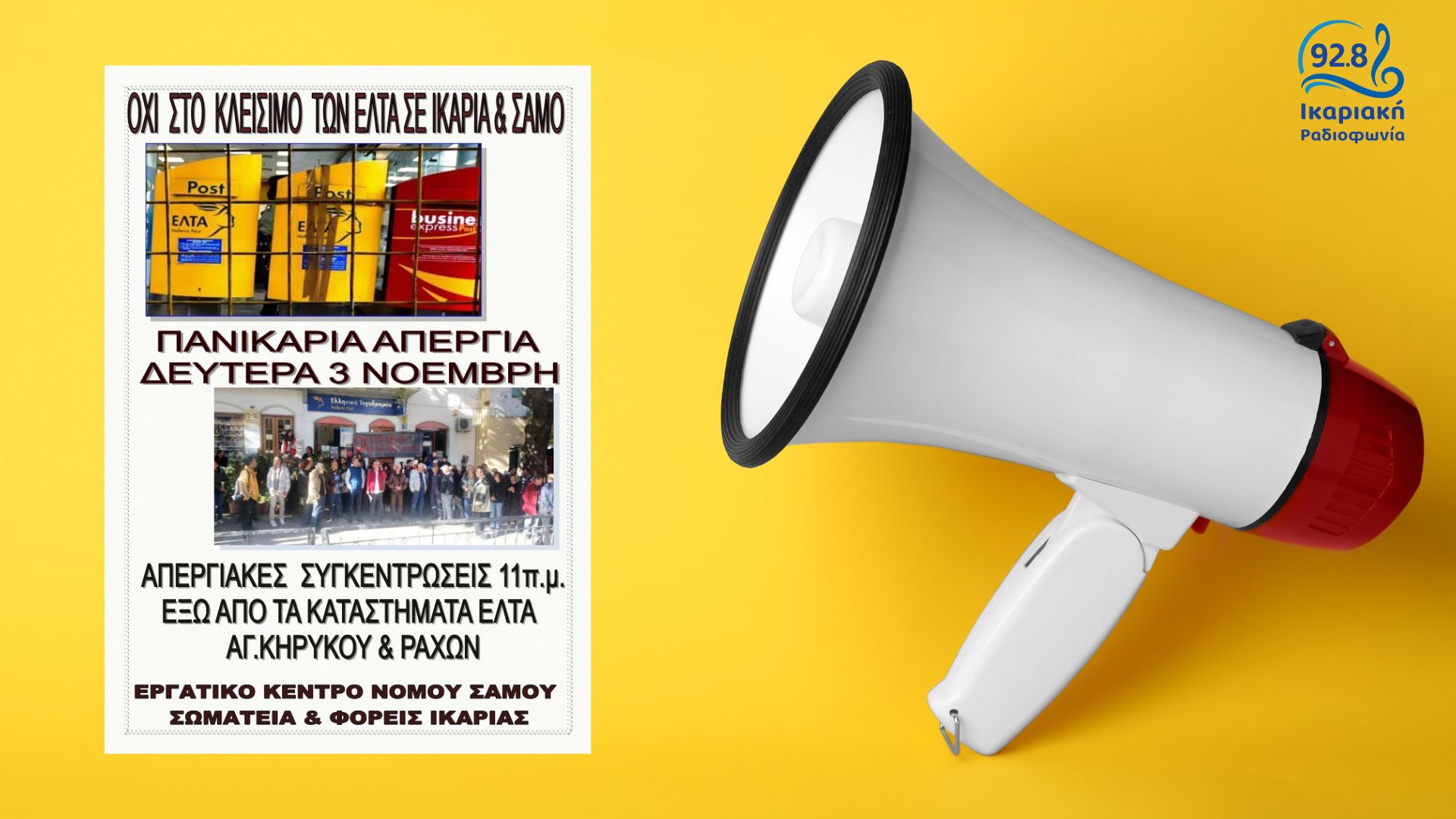 Κλειστά θα μείνουν σήμερα Δευτέρα 3 Νοεμβρίου όλα τα φαρμακεία της Ικαρίας συμμετέχοντας στην Πανικαριακή Απεργία που έχει προκηρύξει το Εργατικό Κέντρο Ν. Σάμου για το κλείσμο των δύο καταστημάτων ΕΛΤΑ στο νησί, Αγίου Κηρύκου και Ραχών.