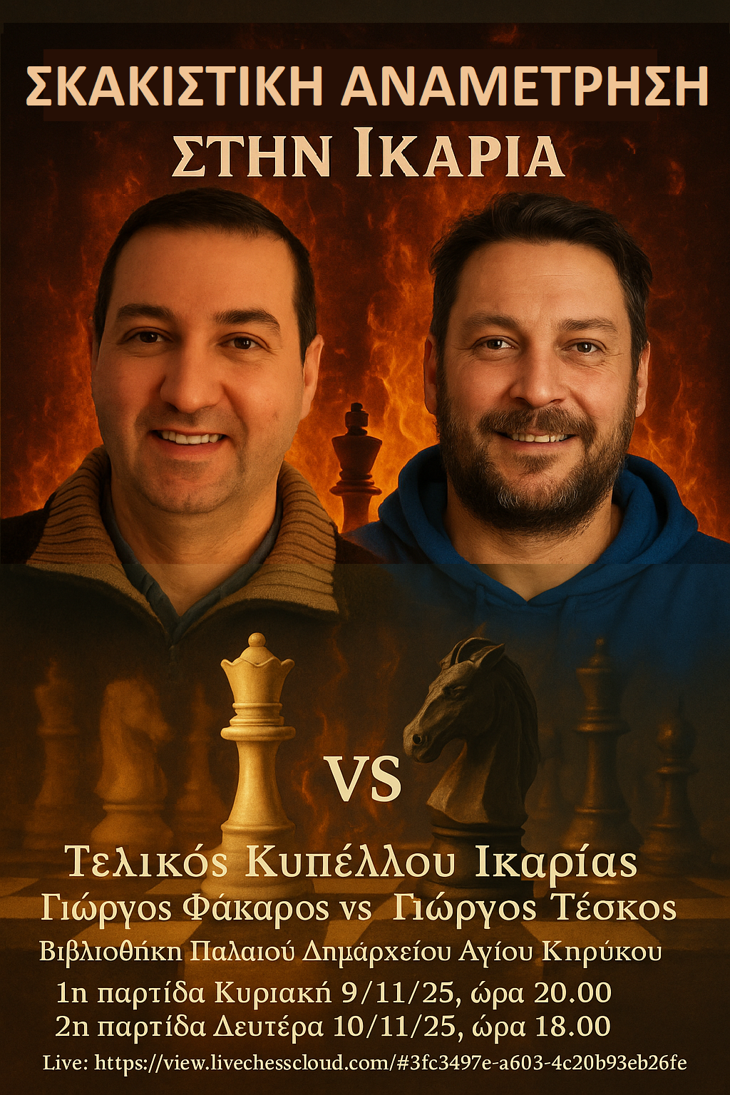 Αρχίζει την Κυριακή 9 Νοεμβρίου, στις 8 το βράδυ, στη βιβλιοθήκη του Παλαιού Δημαρχείου Αγίου Κηρύκου ο Τελικός του Κυπέλλου Ικαρίας μεταξύ του κυπελλούχου Βορειοδυτικής Ικαρίας Γιώργου Φάκαρου και του κυπελλούχου της Νοτιοανατολικής Ικαρίας Γιώργου Τέσκου.
