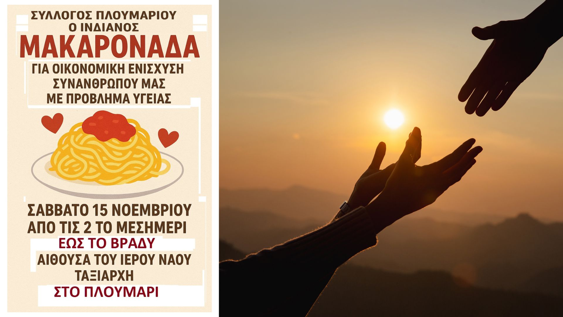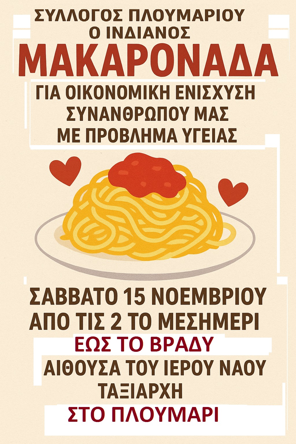 Ο Πολιτιστικός Σύλλογος Πλωμαρίου “Ο Ινδιάνος” σας προσκαλεί το Σάββατο 15 Νοεμβρίου σε μακαρονάδα για τη στήριξη συνανθρώπου μας με πρόβλημα υγείας.