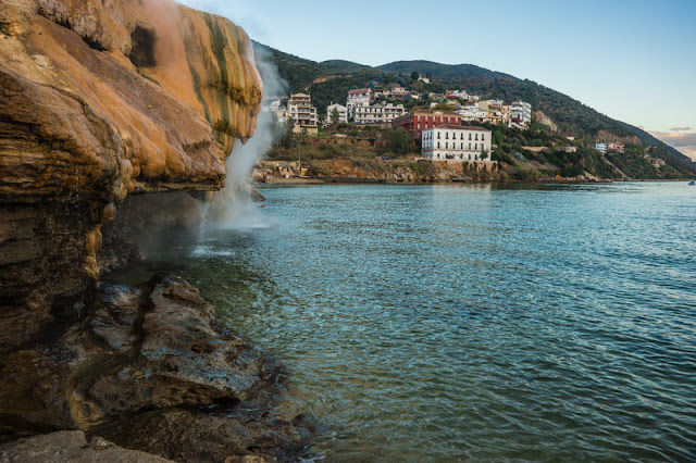 Τα ιαµατικά νερά της πηγής αναβλύζουν παράκτια και υποθαλάσσια στην επαφή µαρµάρων και γνευσίων.