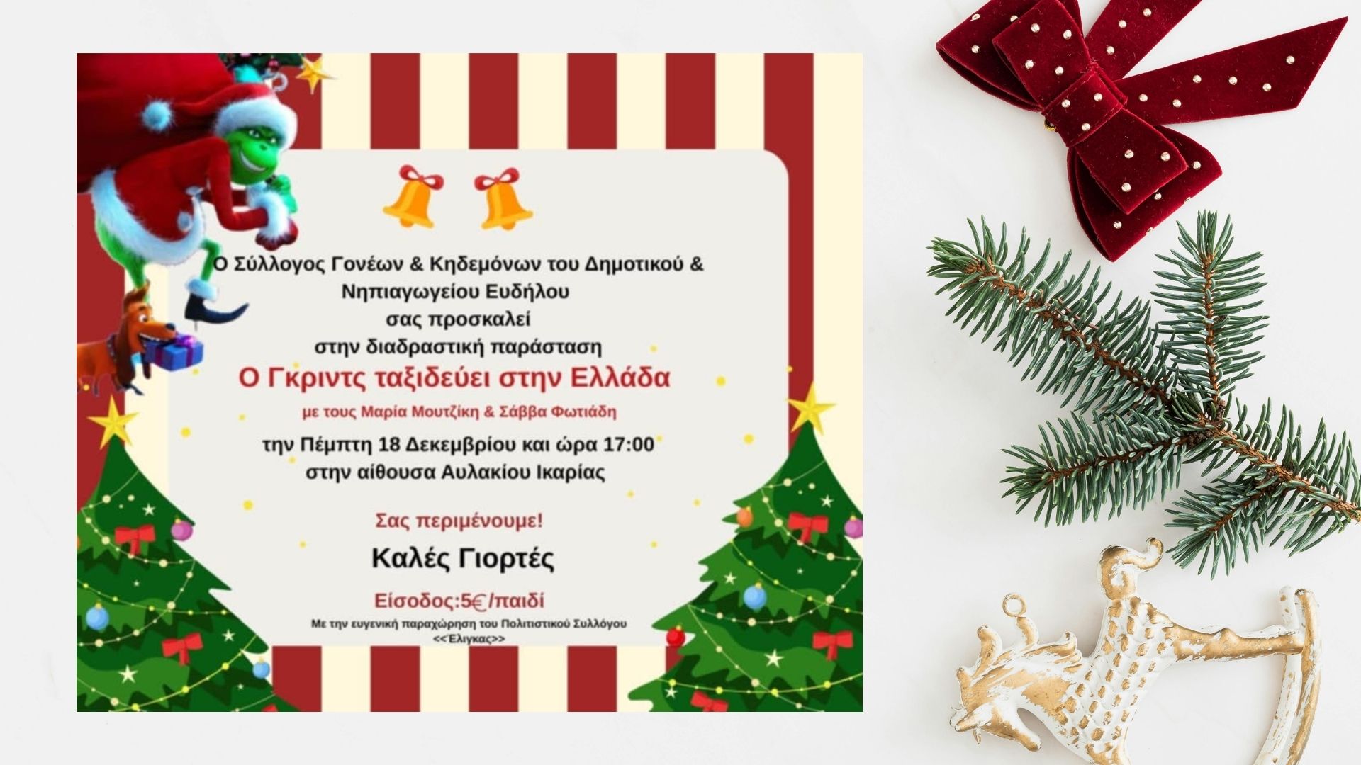 Ο Σύλλογος Γονέων και Κηδεμόνων Δημοτικού Σχολείο και Νηπιαγωγείου Ευδήλου σας προσκαλεί ση χριστουγεννιάτικη παράσταση ο Γκριντς ταξιδεύει στην Ελλάδα την Πέμπτη 18 Δεκεμβρίου και ώρα 17.00 στην πολιστική αίθουσα στο Αυλάκι.