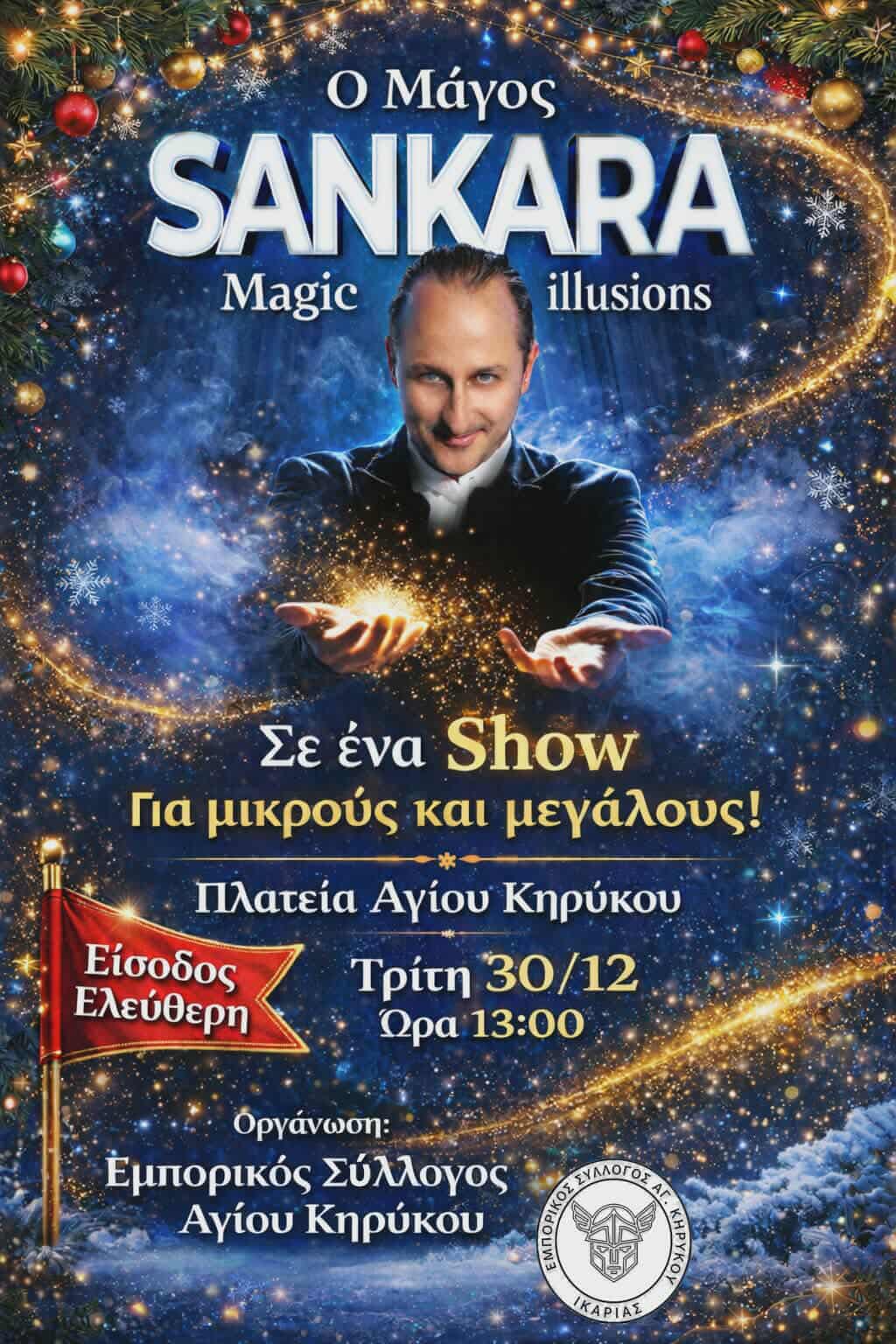Ο Εμπορικός Σύλλογος Αγίου Κηρύκου υποδέχεται τον Μάγο Sankara και σας προσκαλεί στις 30 Δεκεμβρίου και ώρα 13.00 στη πλατεία Αγίου Κηρύκου σε μια μοναδική εμπειρία με οφθαλμαπάτες και μαγικά για μικρούς και μεγάλους.