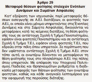 Ομόφωνα ψηφίστηκε στη Βουλή το άρθρο 29 του νόμου 4327/2015, σύμφωνα με το οποίο υπάρχουν ελεύθερες μετεγγραφές για όσους υπηρετούν μόνιμα στις Ένοπλες Δυνάμεις και στα Σώματα Ασφαλείας.