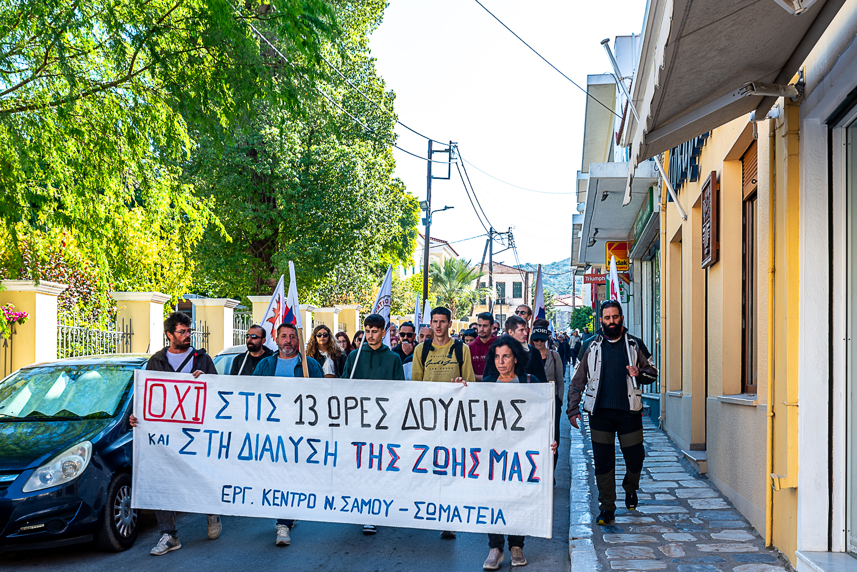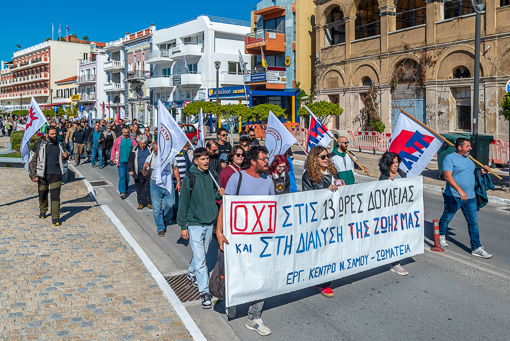 Στην πλατεία Πυθαγόρα στη Σάμο. Οι εργαζόμενοι ξεκινώντας από το Εργατικό Κέντρο με πορεία και με συνθήματα όπως «7ωρο – 5νθημερο σταθερή δουλειά, αυτό ζητάει η εργατιά», «Το 13ωρο δεν θα εφαρμοστεί, με οργάνωση και αγώνα θα ανατραπεί», έστειλαν μήνυμα ότι αγωνιζόμαστε να μην έρθει το 13ωρο να πλακώσει τις ζωές μας και για να υπερασπιστούμε τη μεγαλύτερη κατάκτησή μας, το 8ωρο!
