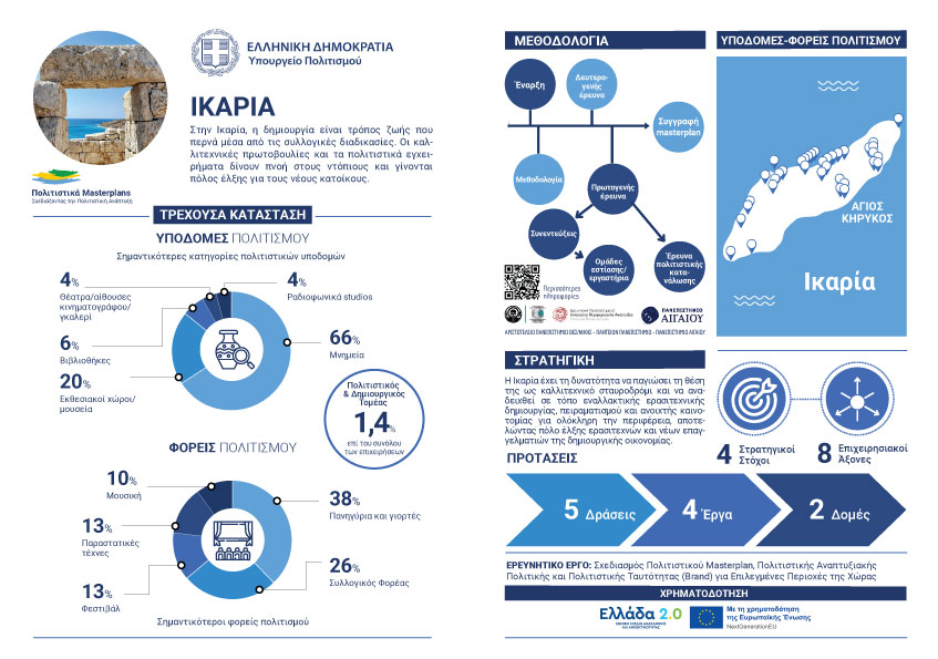 Τα Πολιτιστικά Masterplans αποτελούν ένα καινοτόμο έργο στρατηγικού σχεδιασμού του Υπουργείου Πολιτισμού, που υλοποιείται με χρηματοδότηση από το Ταμείο Ανάκαμψης και Ανθεκτικότητας (ΤΑΑ). Μέσα από επιτόπιες έρευνες, ερωτηματολόγια, συνεντεύξεις και συμμετοχικά εργαστήρια, που πραγματοποίησαν ερευνητές από το Αριστοτέλειο Πανεπιστήμιο Θεσσαλονίκης, το Ινστιτούτο Περιφερειακής Ανάπτυξης του Παντείου Πανεπιστημίου και το Πανεπιστήμιο Αιγαίου, αναδεικνύεται η πολιτιστική φυσιογνωμία κάθε πόλης ή νησιού και προτείνονται στρατηγικές για τη βιώσιμη ανάπτυξη, την εξωστρέφεια και τη συνεργασία.