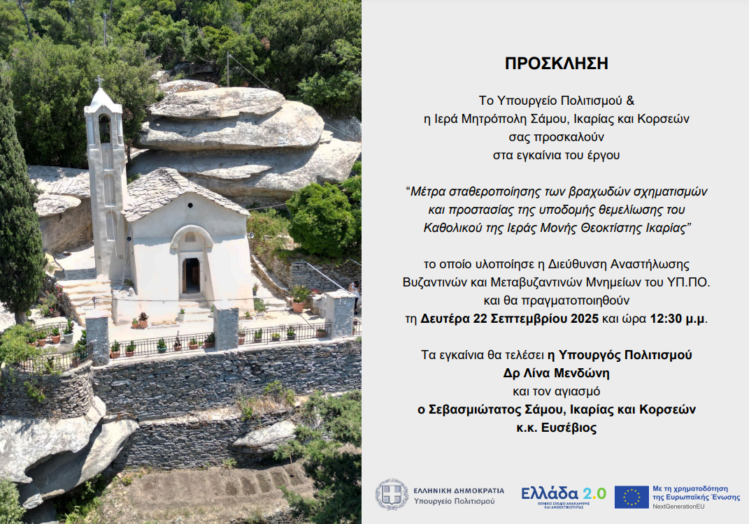 Στην Ικαρία θα βρεθεί, σύμφωνα με πληροφορίες, την Δευτέρα 22 Σεπτεμβρίου η Υπουργός Πολιτισμού Λίνα Μενδώνη συνοδευόμενη από επιστημονικό κλιμάκιο του Υπουργείου για τα θυρανοίξια της Μονής Θεοκτίστης όπου ολοκληρώθηκε το έργο «Μέτρα σταθεροποίησης και βραχωδών σχηματισμών και προστασίας της υποδομής θεμελίωσης του Καθολικού της Ιεράς Μονής Θεοκτίστης Ικαρίας».