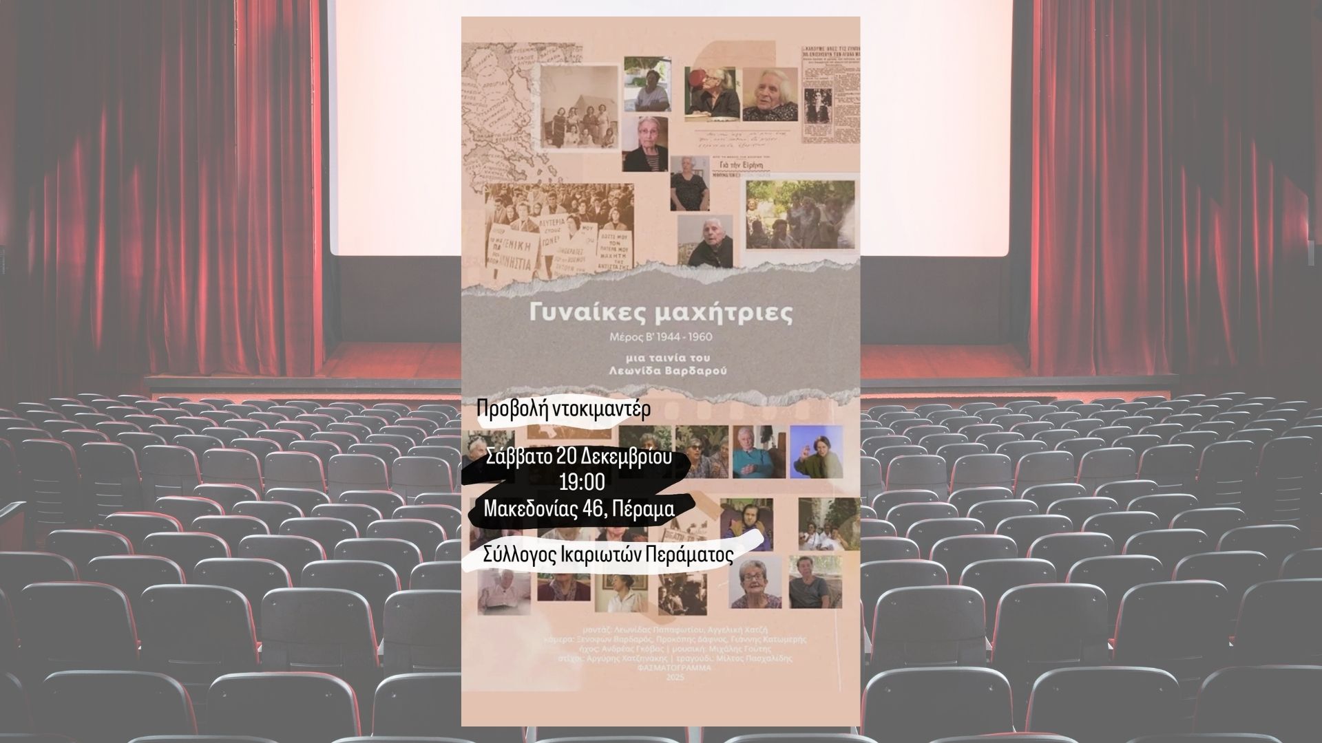 Το Σάββατο 20 Δεκεμβρίου στις 7:00 μμ σας περιμένουμε στην προβολή του ντοκιμαντέρ “Γυναίκες Μαχήτριες Μέρος Β” στην αίθουσα του συλλόγου, Μακεδονίας 46, Πέραμα.
